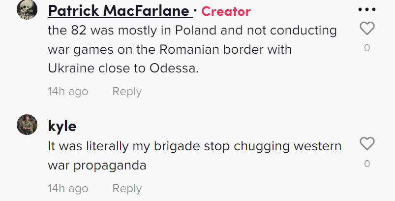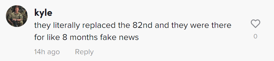 It is unclear to me if this commenter is claiming to be part of the 82nd Airborne or the 101st. It is further unknown to me if the U.S. military allows soldiers to reveal the details of their deployments, or to actively use social media apps like TikTok. I somehow doubt it, but I could be wrong.
